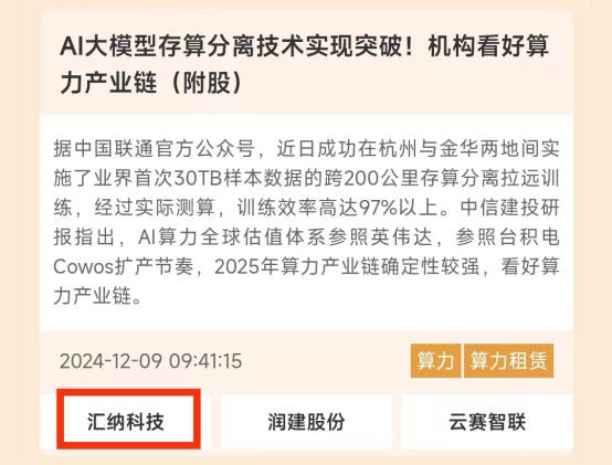 火线快评团队分析判断,此是AI大模型存算分离技术的新突破,可能会对算力概念形成催化,因此梳理了算力概念的投资逻辑及相关上市公司,并在12月9日盘中发布了资讯。文中提到的汇纳科技,在资讯发布后的5日内最高上涨了13.73%。
