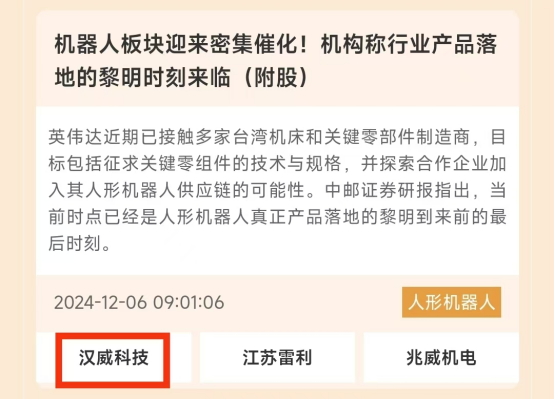 团队于12月6日盘前发布资讯文章,梳理了人形机器产业链的投资逻辑及相关上市公司。文中提及的汉威科技,在资讯发布后的5日内最高上涨了26.25%;江苏雷利也在资讯发布后的3日内最高上涨了22.34%。